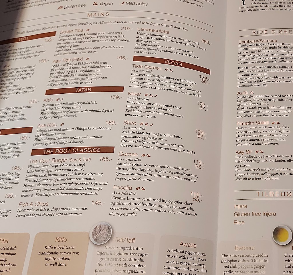 The Root Restaurant tilbyder en bred vifte af Østafrikanske og Nordafrikanske retter, der spænder fra krydrede kødretter til vegetariske og veganske muligheder. Deres menu omfatter populære retter som injera, tagine, samosaer og meget mere. Udover maden tilbyder de også et udvalg af eksotiske drikkevarer, der supplerer og forbedrer smagsoplevelsen. Deres erfarne kokke og venlige personale sikrer, at hver gæst får en uforglemmelig oplevelse.