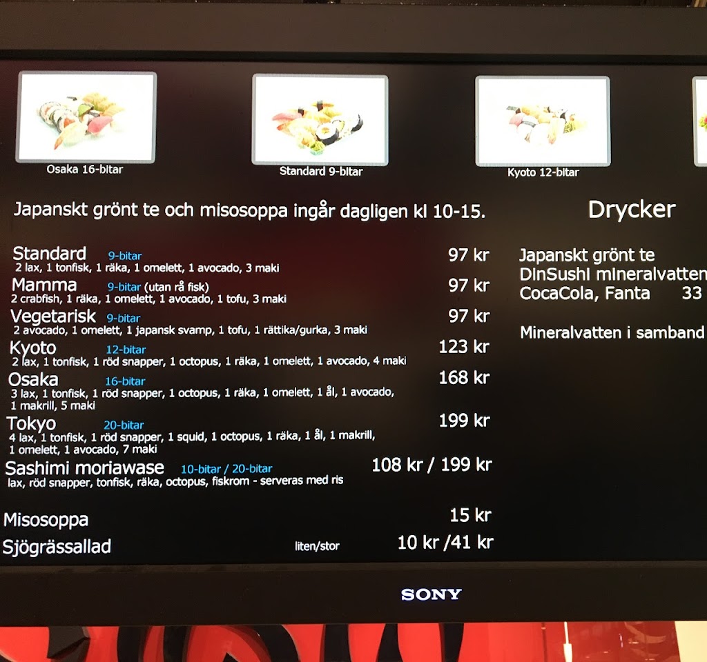 Din Sushi erbjuder ett brett utbud av japanska rätter och specialiteter. Deras meny inkluderar ett stort urval av sushi, inklusive både traditionella och moderna variationer. För de som föredrar något annat än sushi, erbjuder de också tempura donburi, en härlig kombination av friterade rätter serverade över ris. Deras meny är noggrant sammansatt för att tillfredsställa alla smaker och preferenser.
