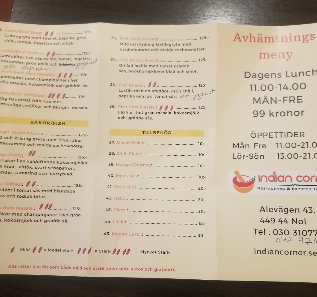 Indian Corner är en indisk restaurang som ligger på Alevägen 43 i Nol, Sverige. Företaget grundades med syftet att erbjuda autentisk indisk mat till kunderna. Med en bakgrund av traditionella recept och kryddor vill Indian Corner erbjuda en unik matupplevelse för sina kunder. Genom att kombinera smaker och tekniker från olika regioner i Indien, skapar de en varierad meny som tillfredsställer både vegetarianer och köttälskare. Med fokus på kvalitet och service strävar Indian Corner efter att skapa en minnesvärd upplevelse för sina gäster.