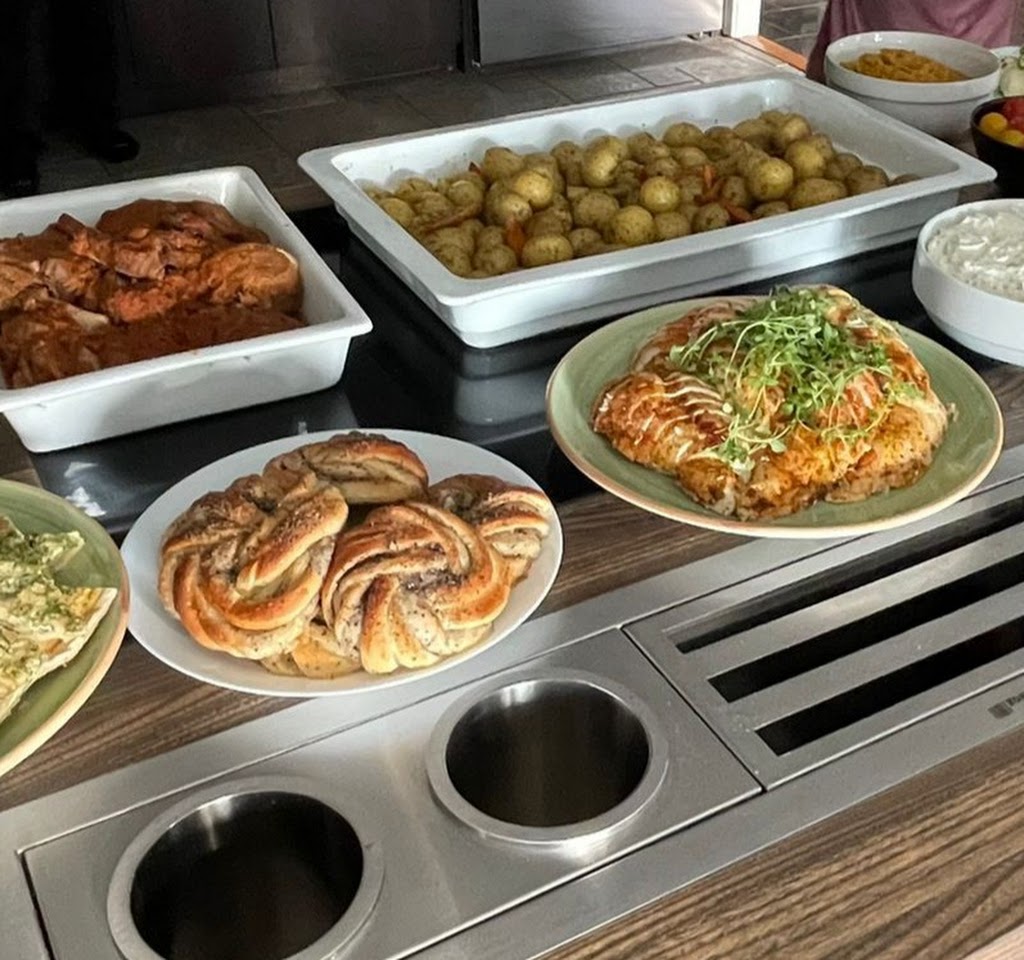 Bra utbud på möjligheter med matservering, trevlig personal, fräsch mat och gott.