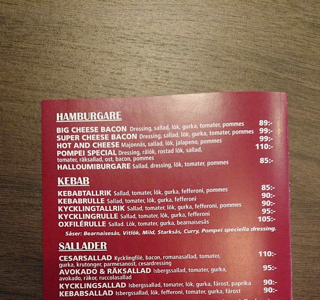 Disciplin, konkret men framförallt hänsynslös. Dessa tre ord beskriver de perfekt. Personalen ger en upplevelse som man kan likna med en disciplinerad Schumacher som sätter millimeter i chikanen men man ska inte ta det förgivet för personalen är konkret utbildade och ser till att jobbet blir gjort ungefär som man jobbar mot klockan på börsen. Här finns det inga kompromisser utan allt är konkret. Fin miljö, helt otrolig caesarsallad och världsklass personal. Men man ska inte glömma att denna restaurang sopar mattan med sina konkurrenter som en Napoli supporter i en mörkgränd i ett hett derby mot Roma så sätter Pompei inga fingrar emellan. Maten ska smaka, maten ska betalas men framförallt maten ska njutas likadant som ett derby ska njutas vilket även kallas för derby de sole i en italiensk mun. Parkering: 10